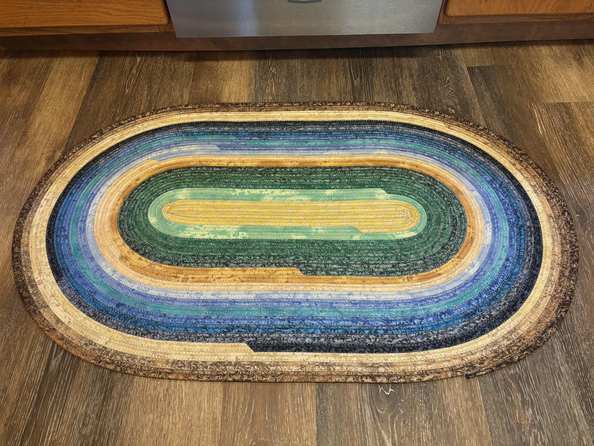 Elevate your living space with the timeless beauty of this handmade jelly roll rug. Perfect for the kitchen, bathroom, or any room that could use a cozy, stylish touch. Soft to the touch yet durable, this low-profile, machine-washable, and reversible rug brings both comfort and practicality into your home.